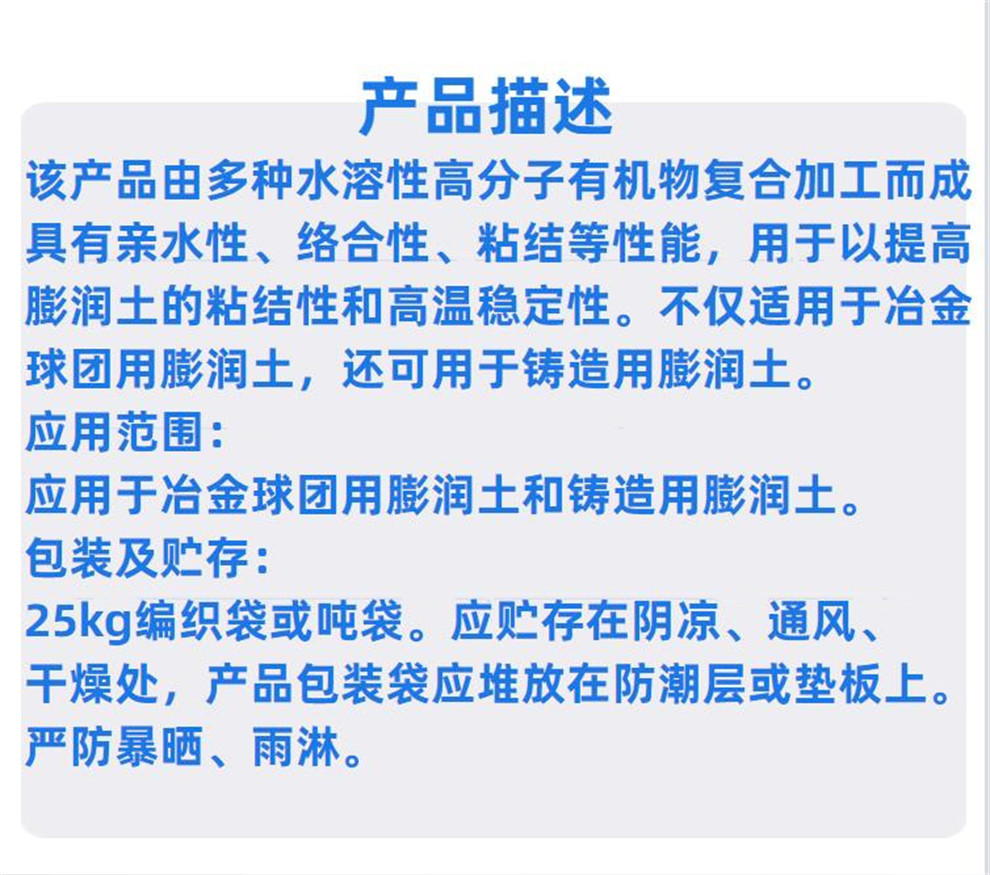 產(chǎn)品介紹:該產(chǎn)品由多種水溶性高分子有機(jī)物復(fù)合加工而成。具有親水性、絡(luò)合性、粘結(jié)等性能,用于以提高膨潤土的粘結(jié)性和高溫穩(wěn)定性。不僅適用于冶金球團(tuán)用膨潤土,還可用于鑄造用膨潤土。應(yīng)用范圍:應(yīng)用于冶金球團(tuán)用膨潤土和鑄造用膨潤土。包裝及貯存:25kg編織袋或噸袋?!?/p>