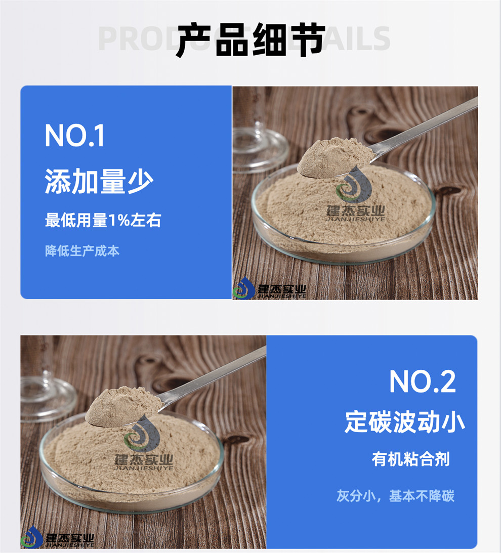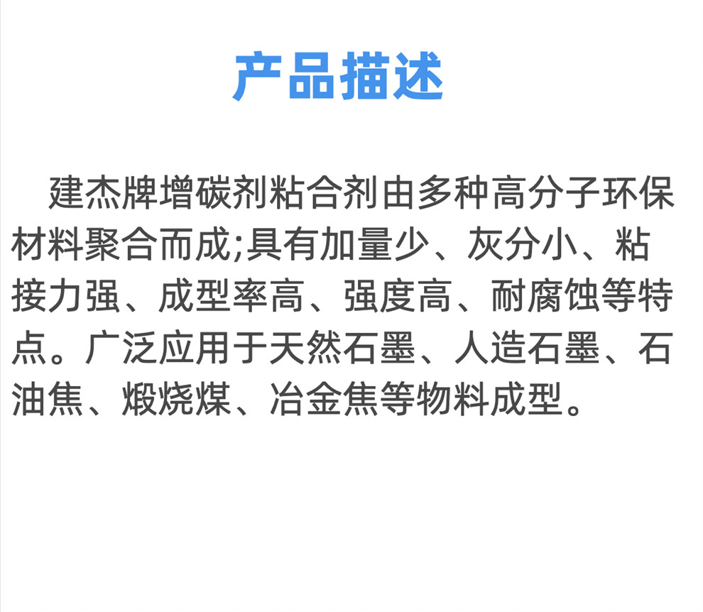 產(chǎn)品介紹:建杰牌增碳劑粘合劑由多種高分子環(huán)保材料聚合而成;具有加量少、灰分小、粘接力強、成型率高、強度高、耐腐蝕等特點。廣泛應(yīng)用于天然石墨、人造石墨、石油焦、煅燒煤、冶金焦等物料成型。產(chǎn)品特點:1.添加量少:*低用量1%左右,降低生產(chǎn)成本。2.固定碳波動?。河小?/p>